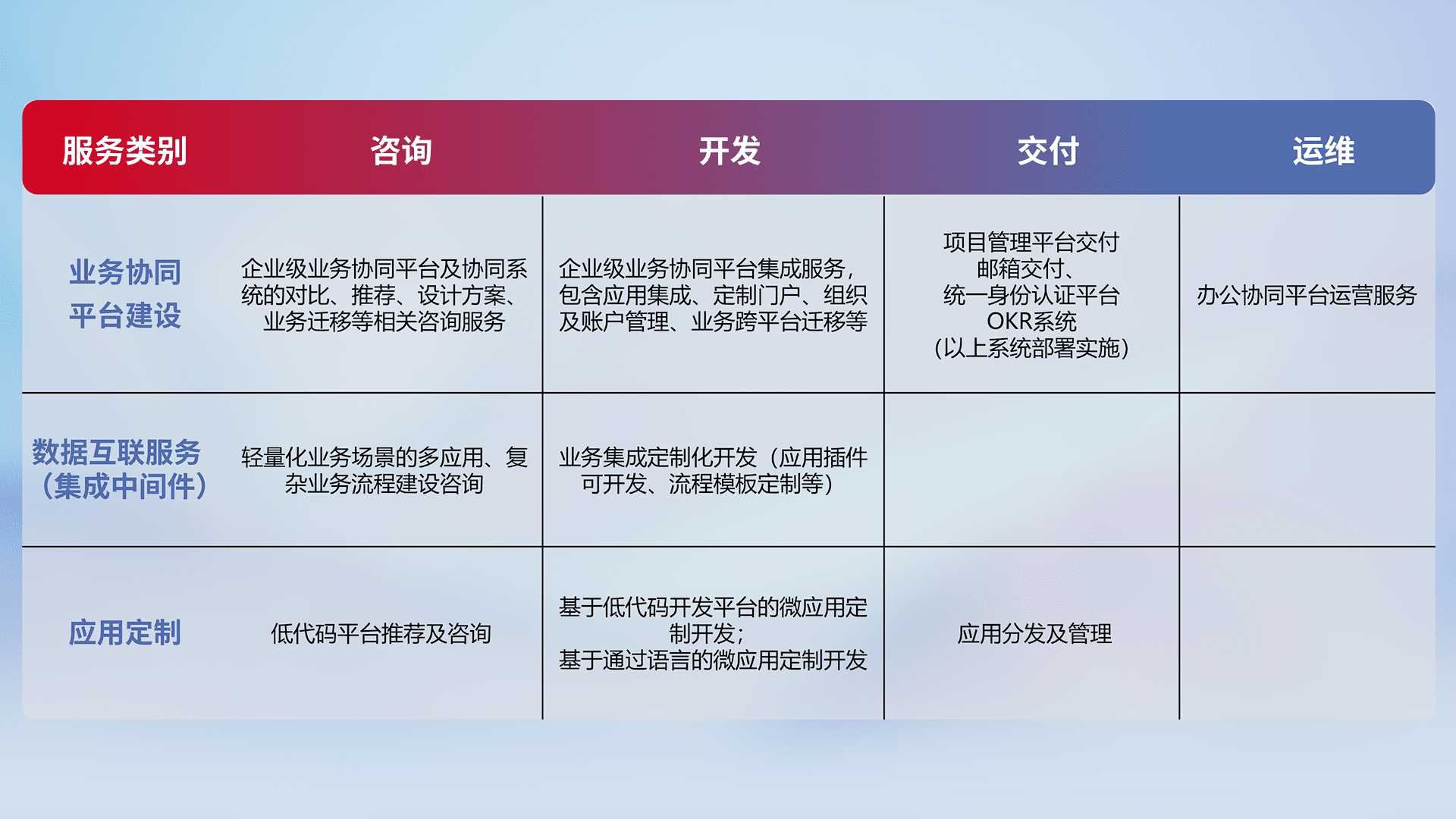 针对钉钉、、企微、、、、IDaas等平台级产品提供产品的规划、、、、方案、、、、交付、、定制化开发等服务,,,,实现如统一协同办公、、、智能客户服务、、、混合会议管理、、、、智能数据查询、、、、等业务场景,,,,实现数字化转型。。。